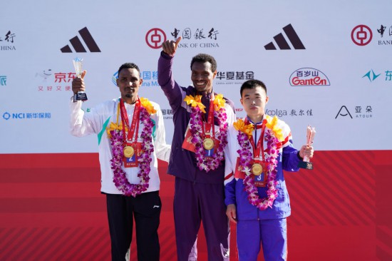 11月2日,男子组冠军埃塞俄比亚选手哈耶尔(中)、亚军埃塞俄比亚选手德贝尔(左)、季军朝鲜选手韩日龙在颁奖仪式上合影。新华社记者 谢晗 摄