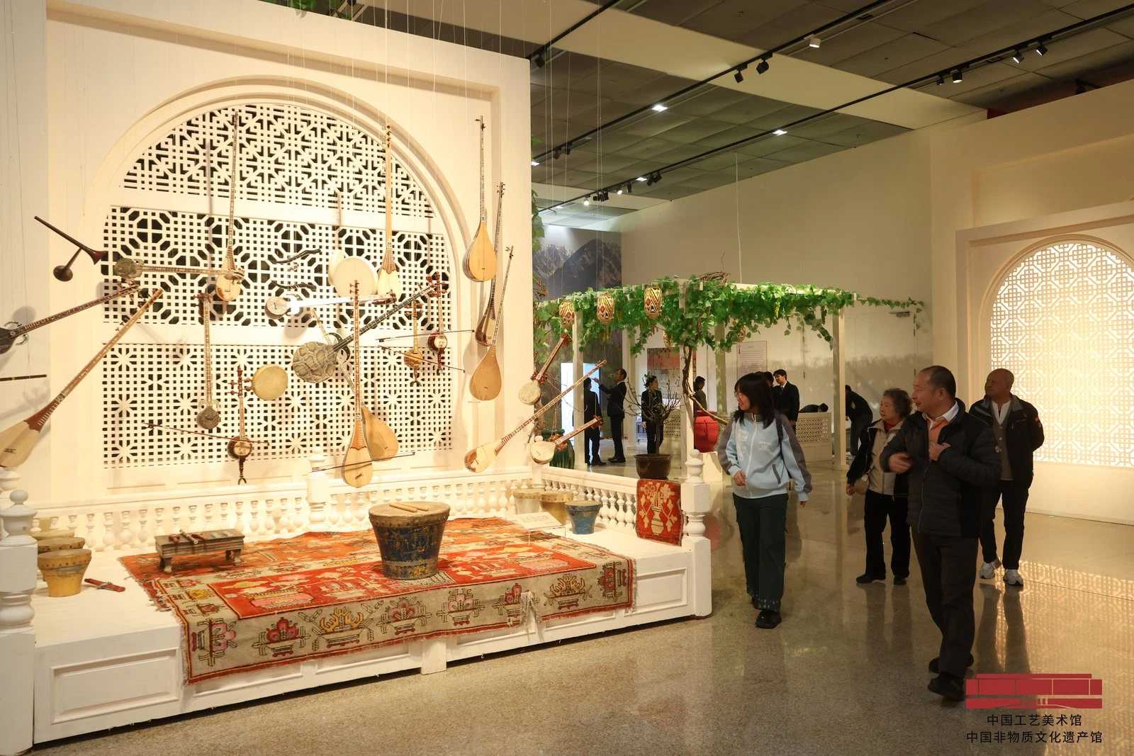 该展览由中国非物质文化遗产馆、新疆维吾尔自治区文化和旅游厅、新疆生产建设兵团文化体育广电和旅游局、和田地区行政公署联合主办。据了解,本次展览共设置昆仑神话、玉出昆冈、丝路名城、万方乐奏、百族骈阗、凝心铸魂六个单元,通过实物展陈、影像播放、技艺演示和互动体验等多种形式,系统呈现了新疆和田地区约30项国家级、自治区级非遗代表性项目,展品近600件,重点展出艾德莱斯绸染织技艺、阿依旺营造技艺、地毯织造技艺、桑皮纸制作技艺等项目。展览不仅生动展现和田地区非遗的文脉传承、独特魅力与时代风采,也串联起和田地区乃至整个新疆的悠久历史和灿烂文化,更加描绘出新时代新疆各民族以饱满的精神风貌在中华民族大家庭中共创美好生活的壮丽画卷。