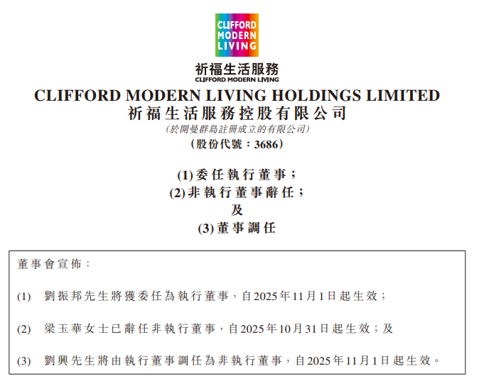 乐居财经 李兰 近日,祈福生活服务(03686.HK)发布公告,刘振邦将获委任为公司执行董事;梁玉华为寻求其他个人发展,已辞任非执行董事,刘兴将由执行董事调任为非执行董事。