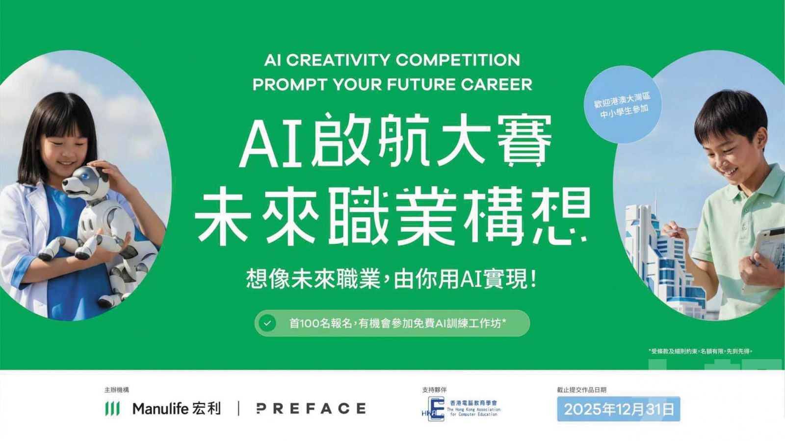為啟發學生對未來的想像,同時鼓勵家長與子女共學探索,宏利香港聯同科技教育機構 Preface於9月起推出「未來啟航增值體驗」,繼「Back-to-School:AI體驗日」及「未來啟航工作坊」系列後,再次聯手舉辦「AI啟航大賽﹕未來職業構想 」,鼓勵港、澳及大灣區內地城市6至18歲的中小學生運用AI技術,探索未來職涯的多元可能,並為迎接未來做好準備。