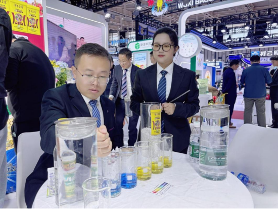 现场设置的产品互动试验区更是成为全场焦点。在溶解实验中,生物有机肥“洋丰豆”全水溶精华版遇水即溶、迅速崩解,展现出了优异的滴灌、喷灌适用性;而在酸碱中和试验中,升级硫基复合肥“洋丰至尊”通过明显的颜色变化,直观展现了其调节土壤酸碱度的独特功效。